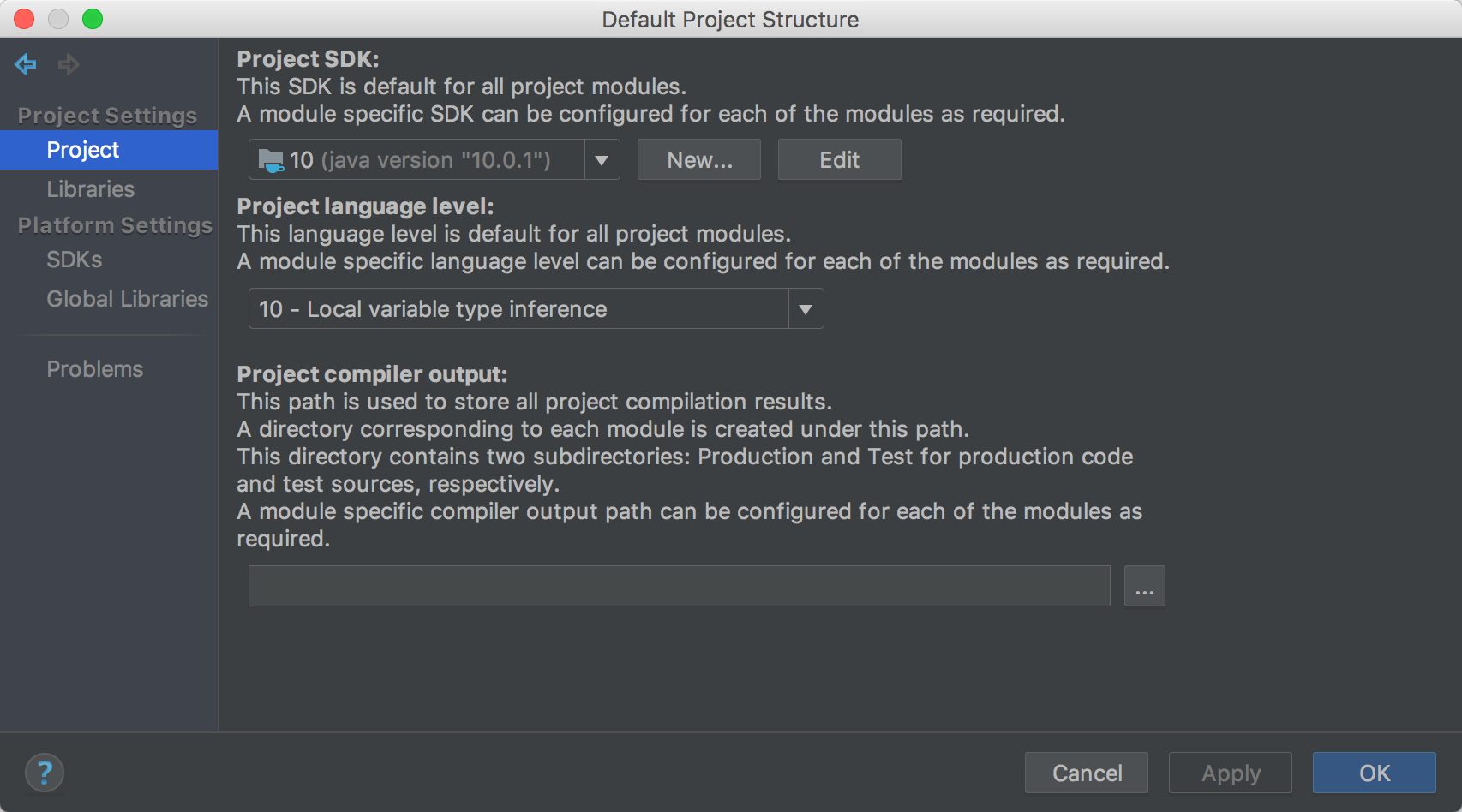 IntelliJ, pracując w kontekście projektu, masz możliwość konfiguracji ustawień projektu dostępnych za pomocą skrótucommand+;lub w menuFile | Project Structureoraz ustawień domyślnych dla wszystkich nowych projektów dostępnych w menuFile | Other Settings.